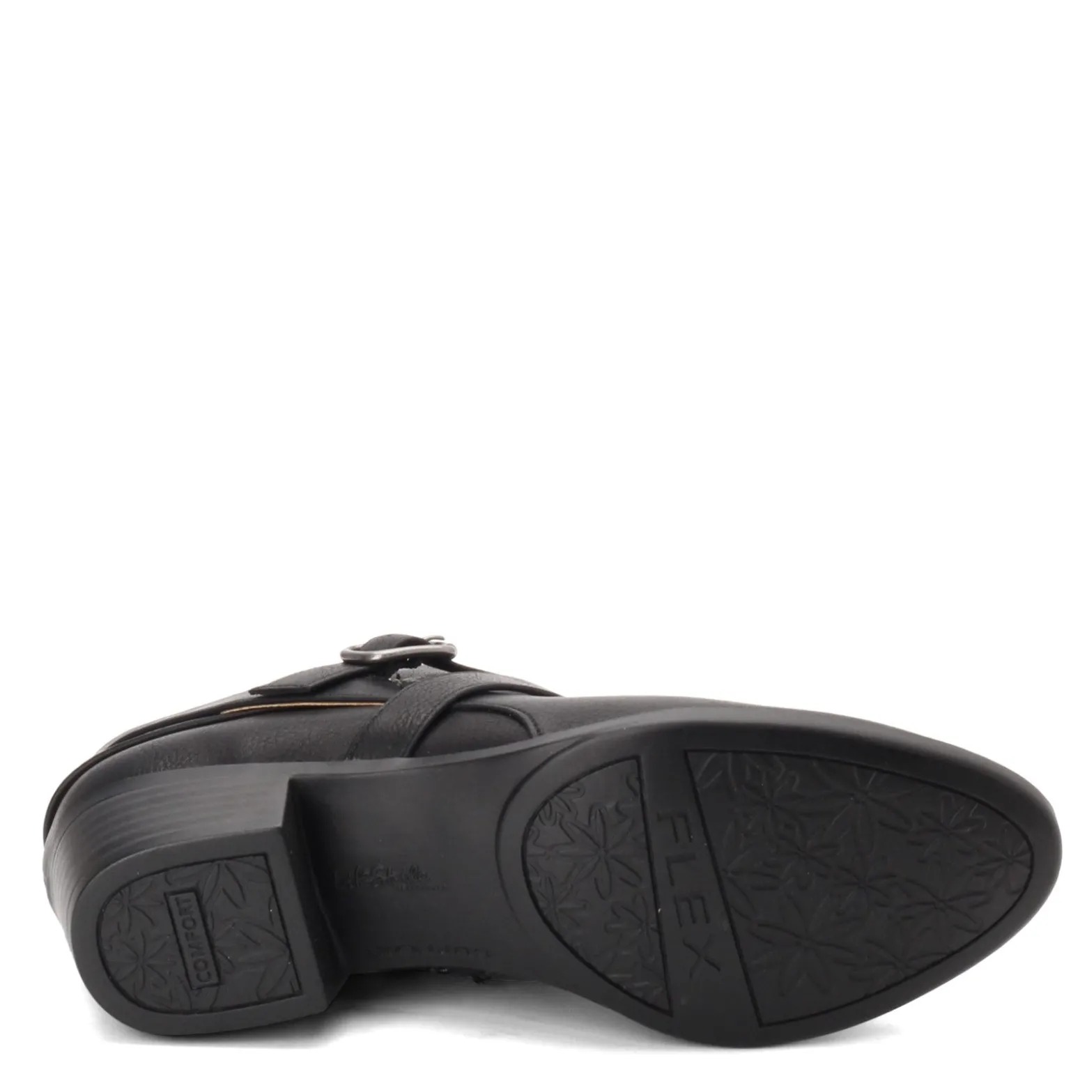 - Faux leather uppers with decorative strap and metallic buckle