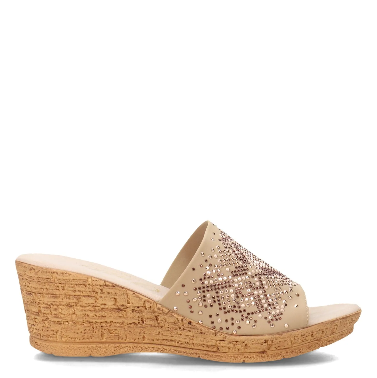 Joline is a beautiful slide sandal with metallic stud accents. A fully cushioned insole, flexible construction and a low wedge make it a comfortable choice for all day wear. This wedge can easily be dressed up or down and is perfect for those summer dresses, skirts and shorts.